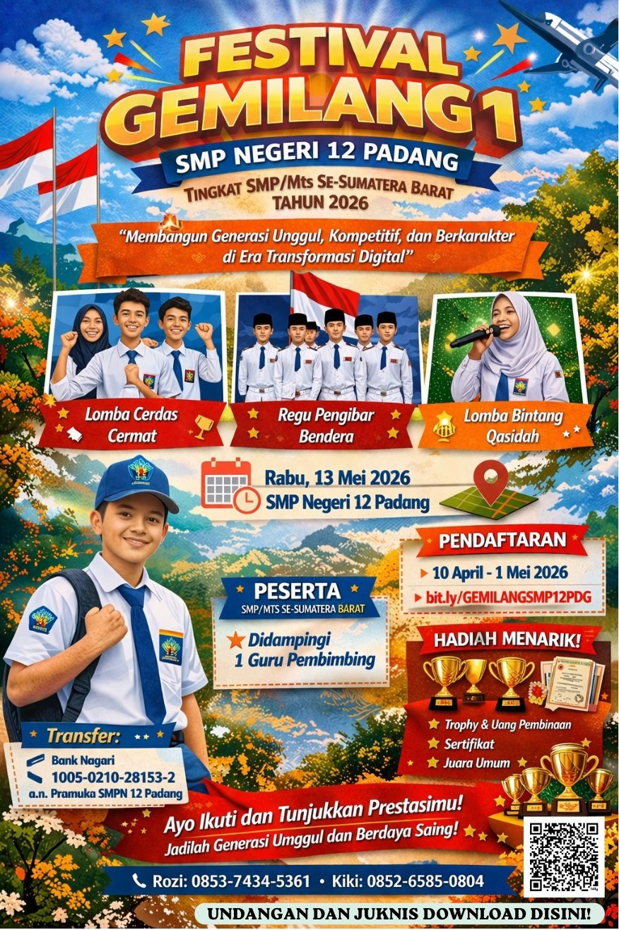 Padang – SMP Negeri 12 Padang akan menggelar kegiatan bertajuk Festival GEMILANG 1 pada Rabu, 13 Mei 2026. Kegiatan ini merupakan ajang kompetisi sekaligus wadah pengembangan potensi bagi peserta didik tingkat SMP/MTs negeri dan swasta se-Sumatera Barat.