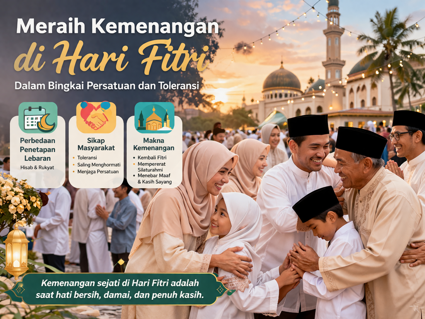 Pada akhirnya, meraih kemenangan di Hari Fitri bukan ditentukan oleh kapan hari itu dirayakan, tetapi oleh sejauh mana nilai-nilai Ramadan tetap terjaga dalam kehidupan sehari-hari. Ketika umat Islam mampu menjaga hati yang bersih, memperkuat persaudaraan, dan menjunjung tinggi toleransi, maka di situlah makna kemenangan yang sesungguhnya.