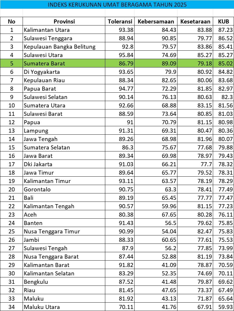 SUMATERA BARAT 5 BESAR INDEKS TOLERANSI 2025: