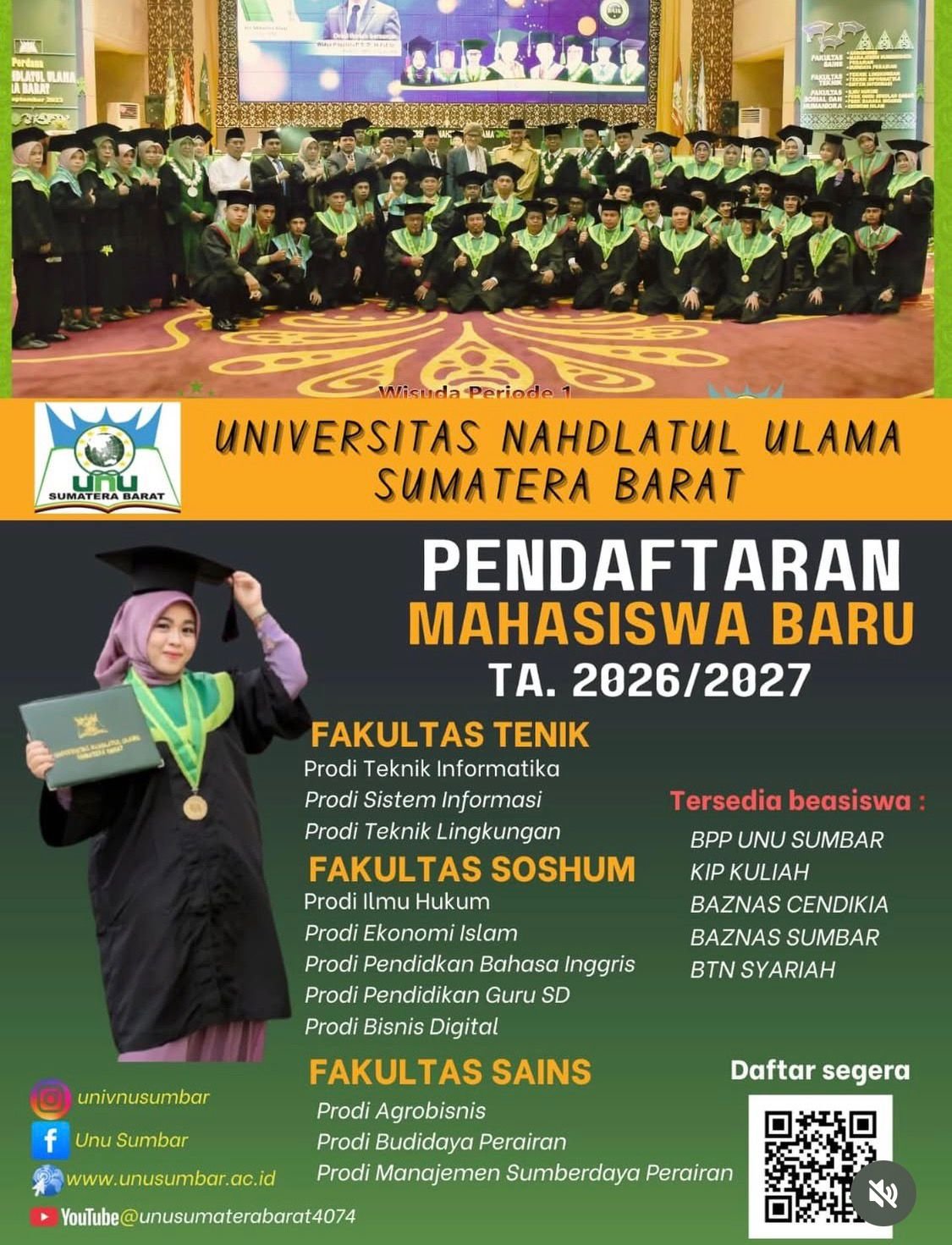 Penerimaan Mahasiswa Baru Tahun Akademik 2026/2027 Universitas Nahdlatul Ulama Sumatera Barat Telah dibuka, Ayo mendaftar dan kunjungi www.unusumbar.ac.id untuk informasi lebih lanjut.
